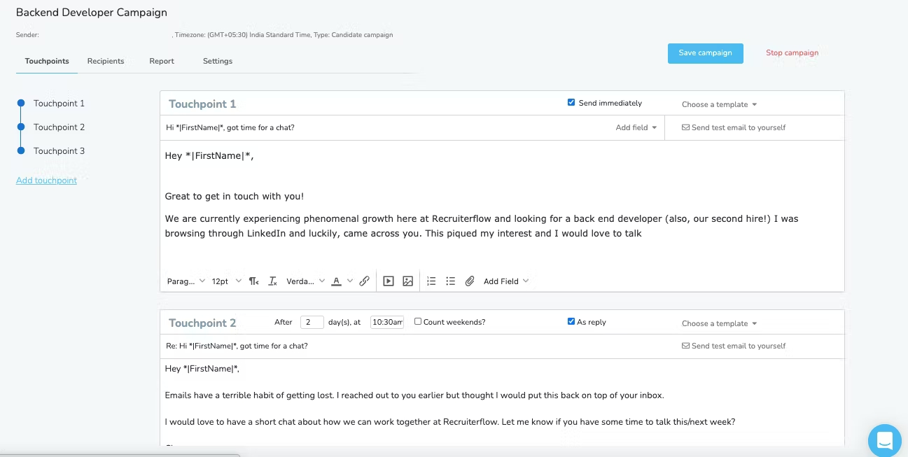 RecruiterFlow highlights its outreach tools as a key strength, offering competitive campaign features compared to legacy recruitment platforms. However, it falls short against specialized outbound tools like HeyReach, Dripify, and Instantly, which provide more robust and advanced capabilities, also for recruiters.