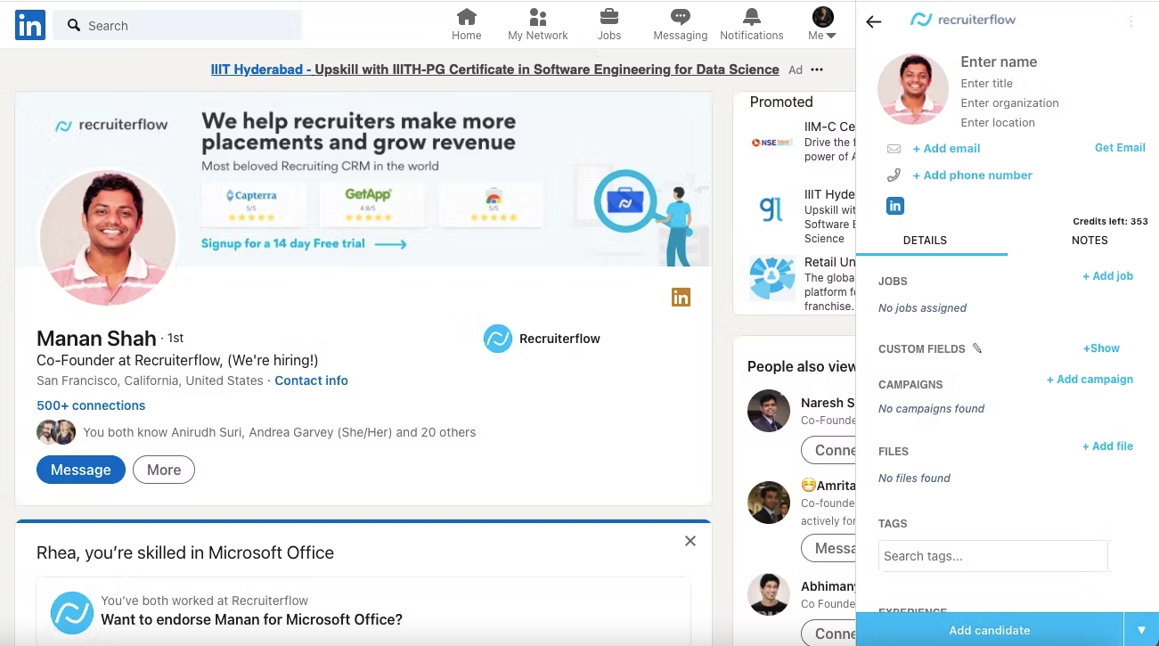 When it comes to sourcing, speed and detail matter. Recruiterflow’s LinkedIn Chrome extension is fast, but often misses work history or education. It also tends to have more bugs than most. On the positive side, it does offer various integrations with tools like Indeed and Juicebox.