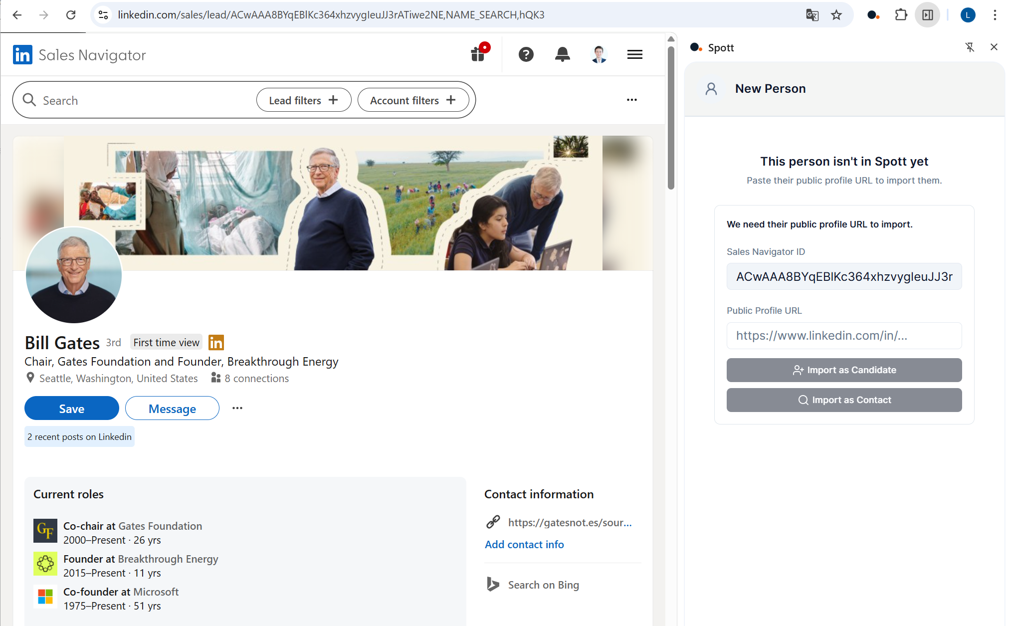 - Public profile lookup - Visit someone's public LinkedIn profile, or paste a public LinkedIn URL into the extension (this also works from Recruiter and Sales Navigator pages). Spott will search for publicly available information and pull in employment history when it's available.