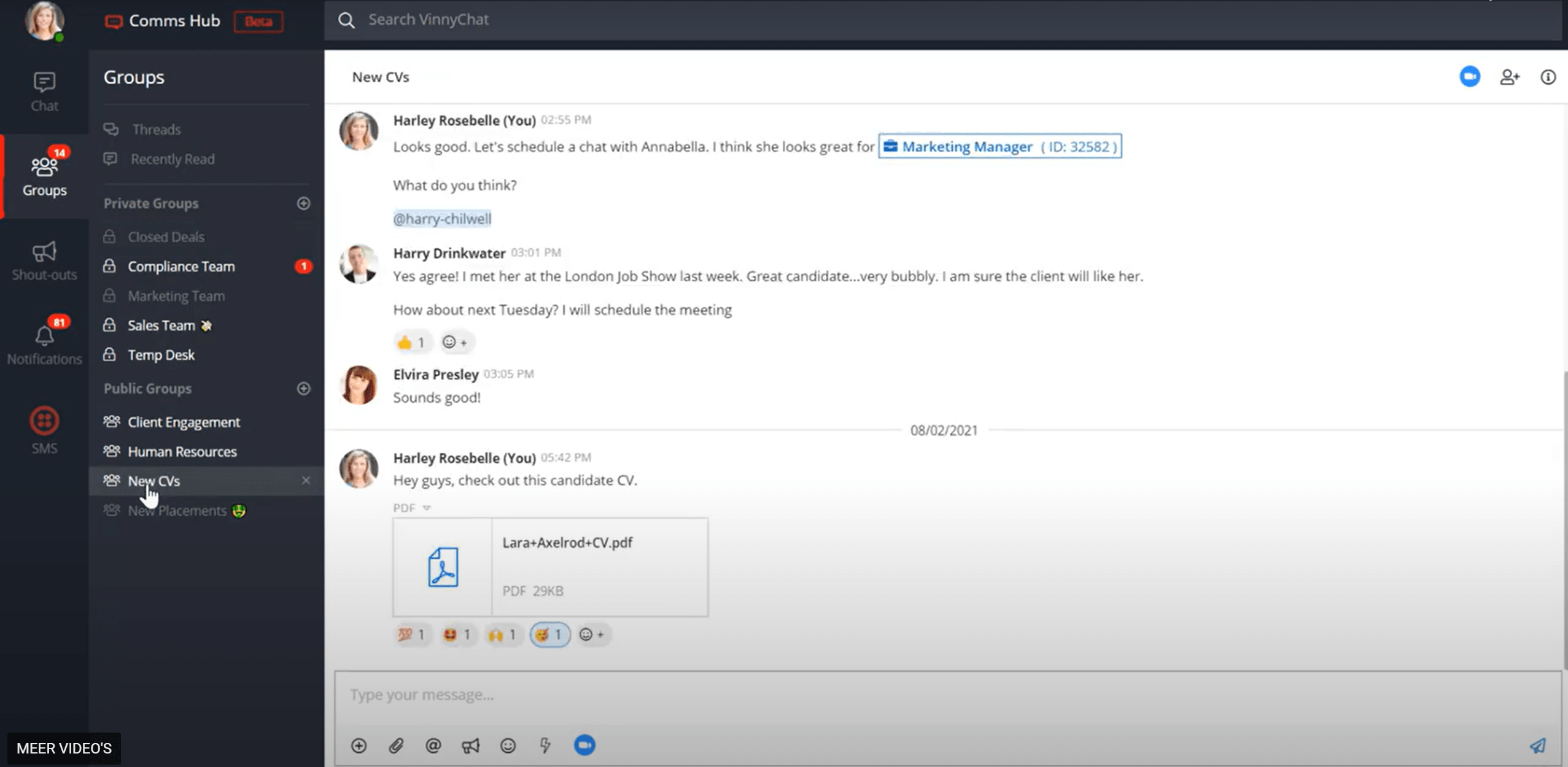 Vincere does offer VinnyChat – their in-house Slack alternative for recruiters, and Vinneo – a proprietary video interview tool with HireVue-style pre-recorded interview questions, which is also the only video interview tool you can integrate with Vincere (you can still take Zoom calls from VinnyChat though, but you will need to rely on Zapier for other integrations like Microsoft Teams).